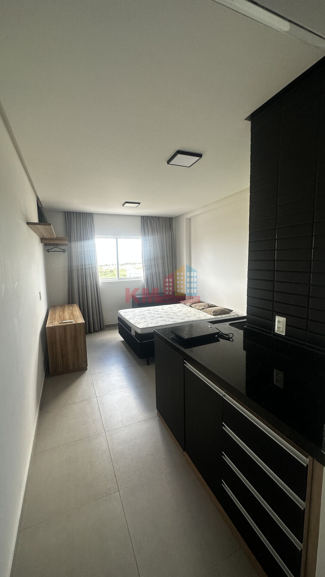 Este apartamento tipo Studio no Residencial West Fit é totalmente mobiliado e projetado, pronto para morar. O imóvel é composto por 1 quarto, banheiro social e cozinha planejada, e já dispõe de cama, ar condicionado, cortina, box no banheiro, geladeira duplex e fogão por indução.