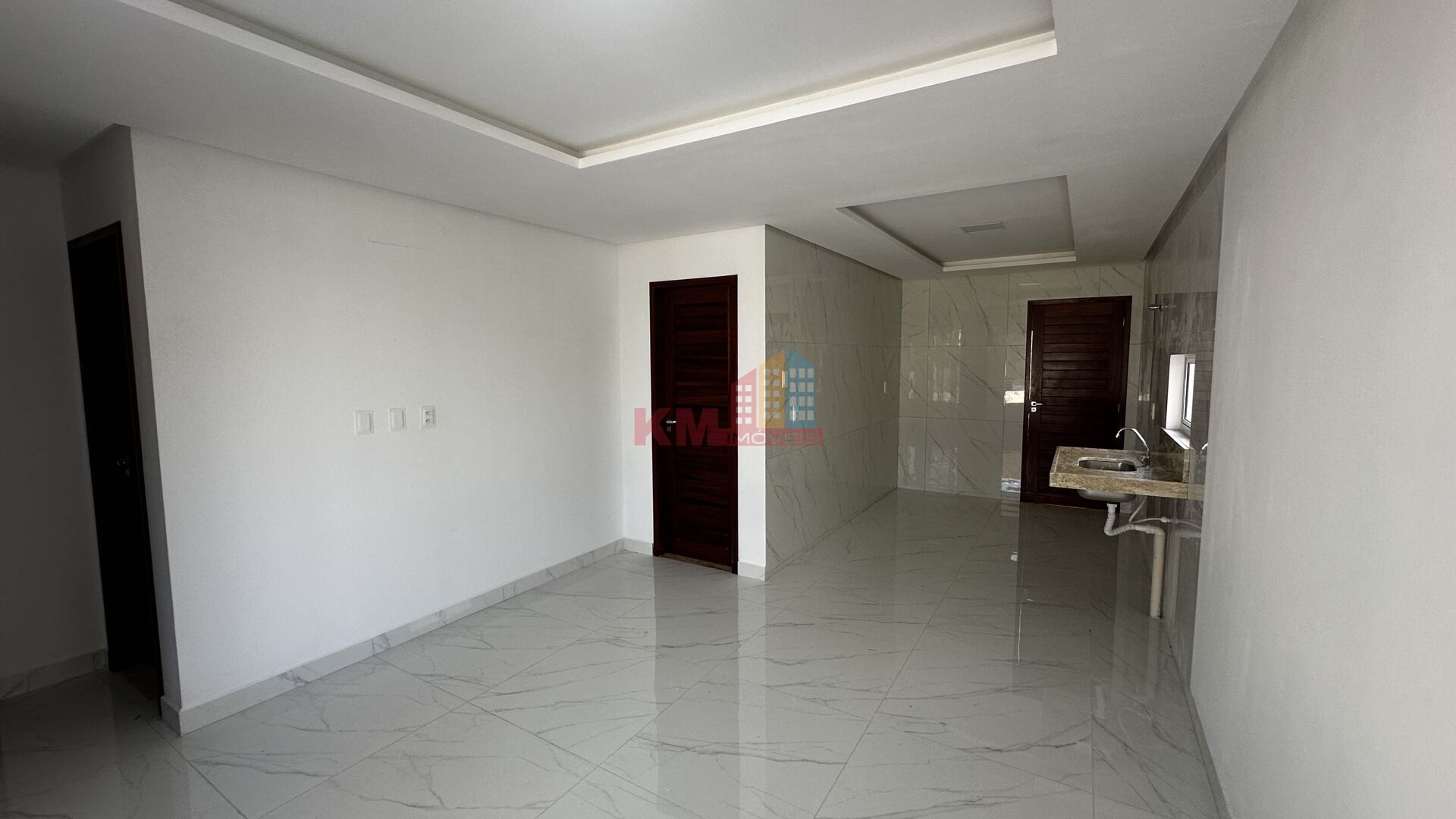O acabamento é um diferencial, com porcelanato em todos os ambientes e teto em laje, proporcionando um visual sofisticado e durabilidade. A integração entre sala e cozinha otimiza o espaço e o convívio.