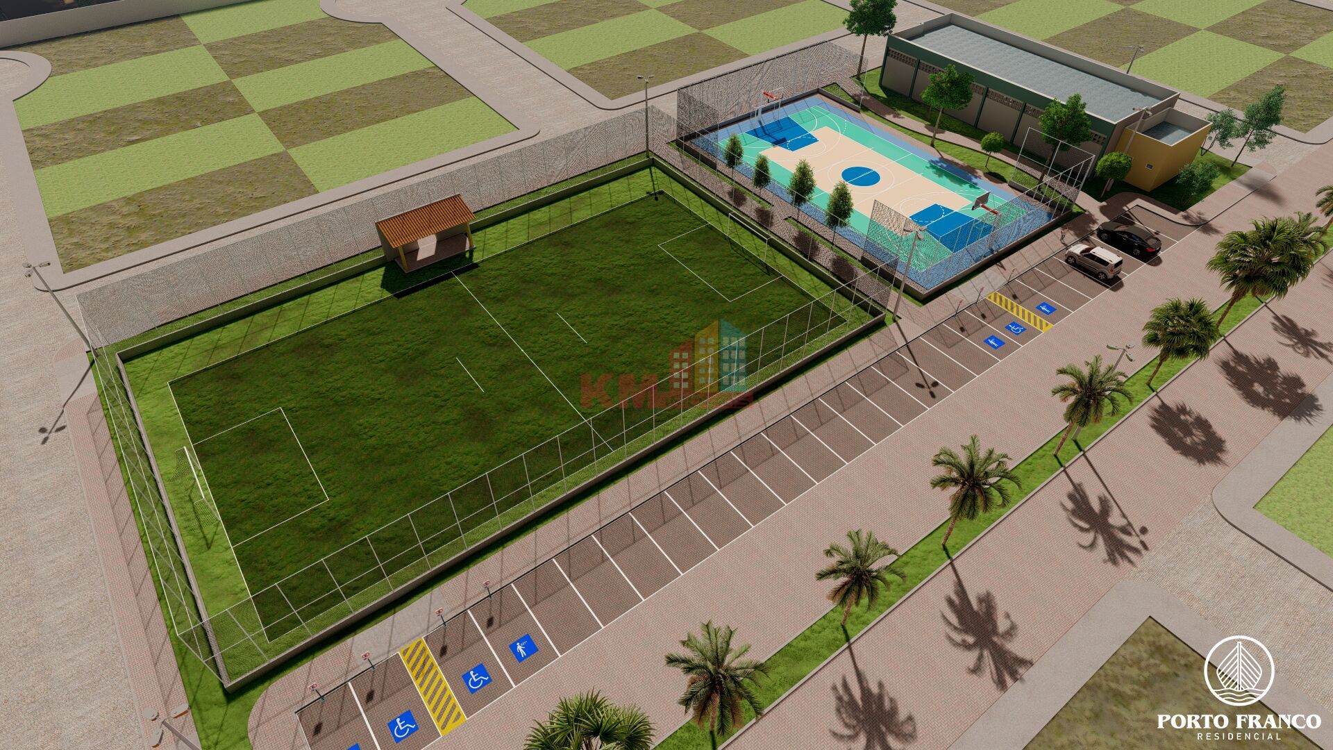 Área de lazer do Porto Franco Residencial: Piscina adulto, Piscina infantil, Vagas de estacionamento na área de lazer, Áreas de convivência, Mini mercado, Campo de futebol, Quadra poliesportiva, Academia, Espaço pet, Playground, Salão de festas.